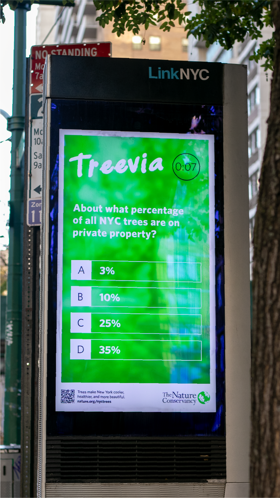 The campaign also included “Treevia,” a citywide trivia game that put New Yorker’s tree knowledge to the test, and directed them to nature.org/nyctrees, where they could learn more about The Nature Conservancy’s work.